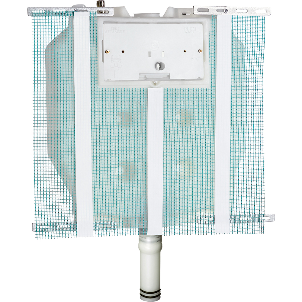 Gruppo sollevamento sfera pneumatico. Riduzione  50/40 mm per tubo di risciacquamento. Staffe di fissaggio. Rete per l’intonaco. Placca di copertura bianca in dotazione. *Per una migliore installazione utilizzare il tubo regolabile Art. 0074502. Nota: Comandi da ordinare a parte.