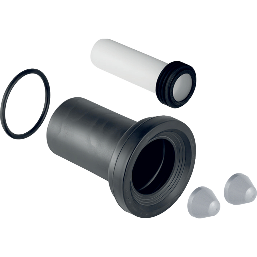 Per vasi sospesi. Materiale in Dotazione: Tubo di risciacquo con morsetto in PE-HD + Raccordo diritto con morsetto in PP + Guarnizione alabbro in EPDM + 2 Cappucci di copertura + Materiale Di fissaggio.