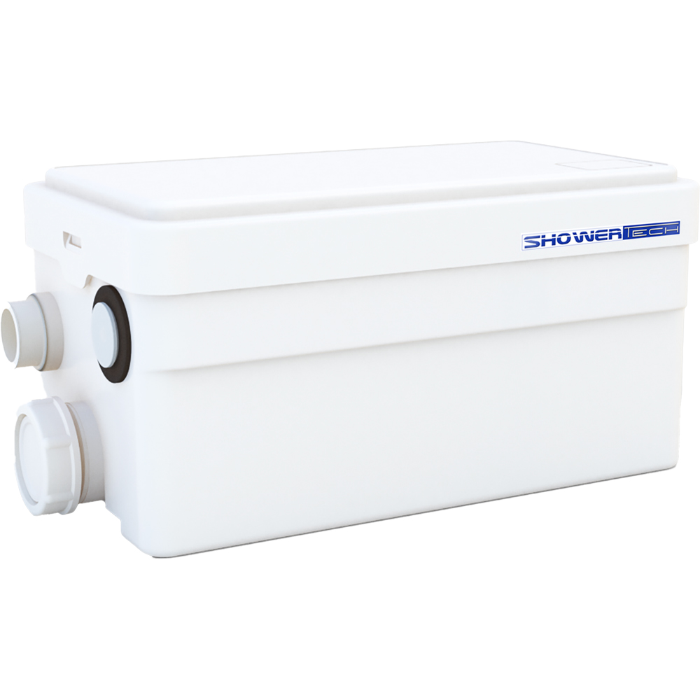 Showertech Š una pompa dalle dimensioni ridotte. Grazie a questa sua particolarit… pu• essere installato anche sotto il piatto doccia o in un piccolo mobile da bagno. E’ dotato di ben 2 entrate, una destra ed una sinistra, per raccogliere le acque provenienti dalla doccia, dal bidet e dal lavabo. E’ inoltre predisposto per il collegamento ad uno o pi— condizionatori per lo scarico delle acque di condensa. ShowerTech viene fornito completo di fissaggi a terra, manicotto di scarico con valvola di non ritorno incorporata, fascette in acciaio, ghiere, guarnizioni e tappi necessari per il collegamento ai tubi di scarico delle utenze. Adatto a tubazioni di scarico da 23 e 28.
