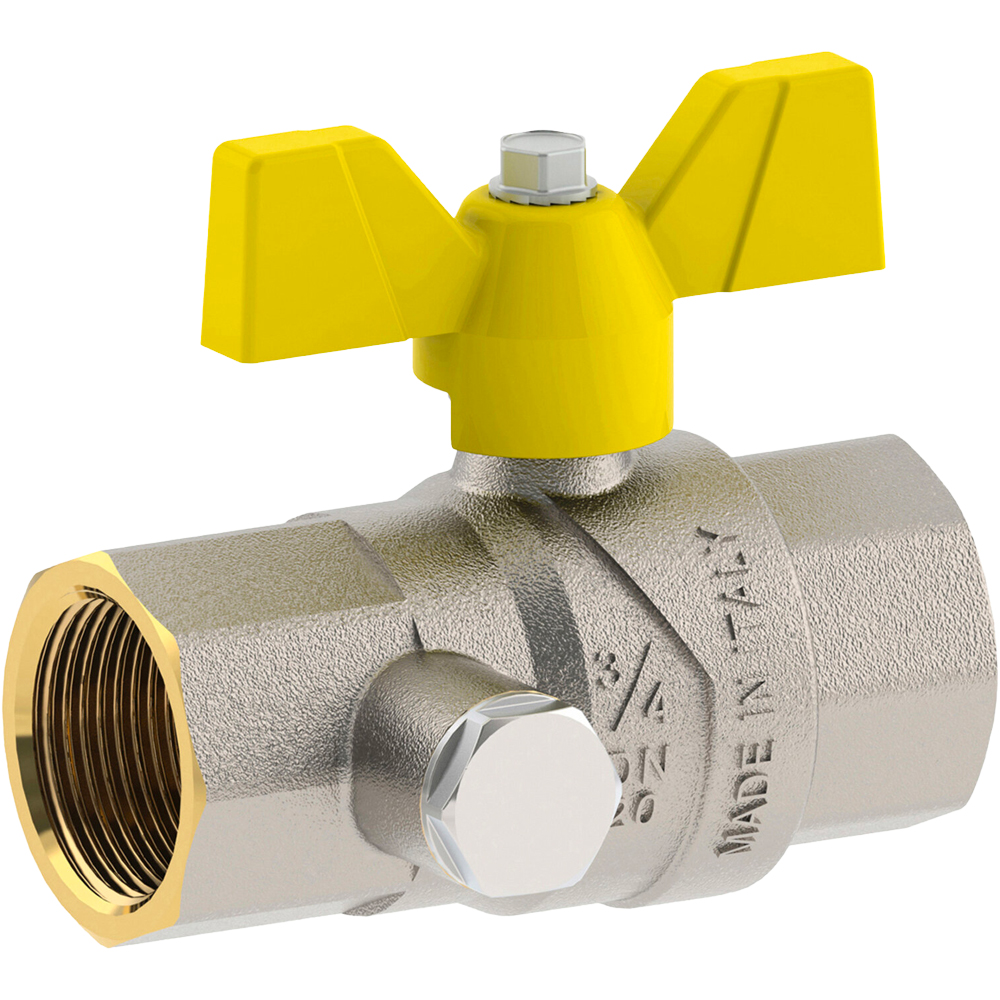 Valvola a sfera per gas nichelata, attacco Femmina-Femmina, con attacchi di pressione, con maniglia a Farfalla in alluminio verniciata gialla.